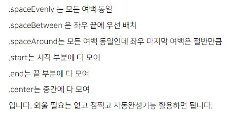 mainAxisAlignment: MainAxisAlignment.spaceEvenly, //정렬속성 쩜을 붙여서 씀